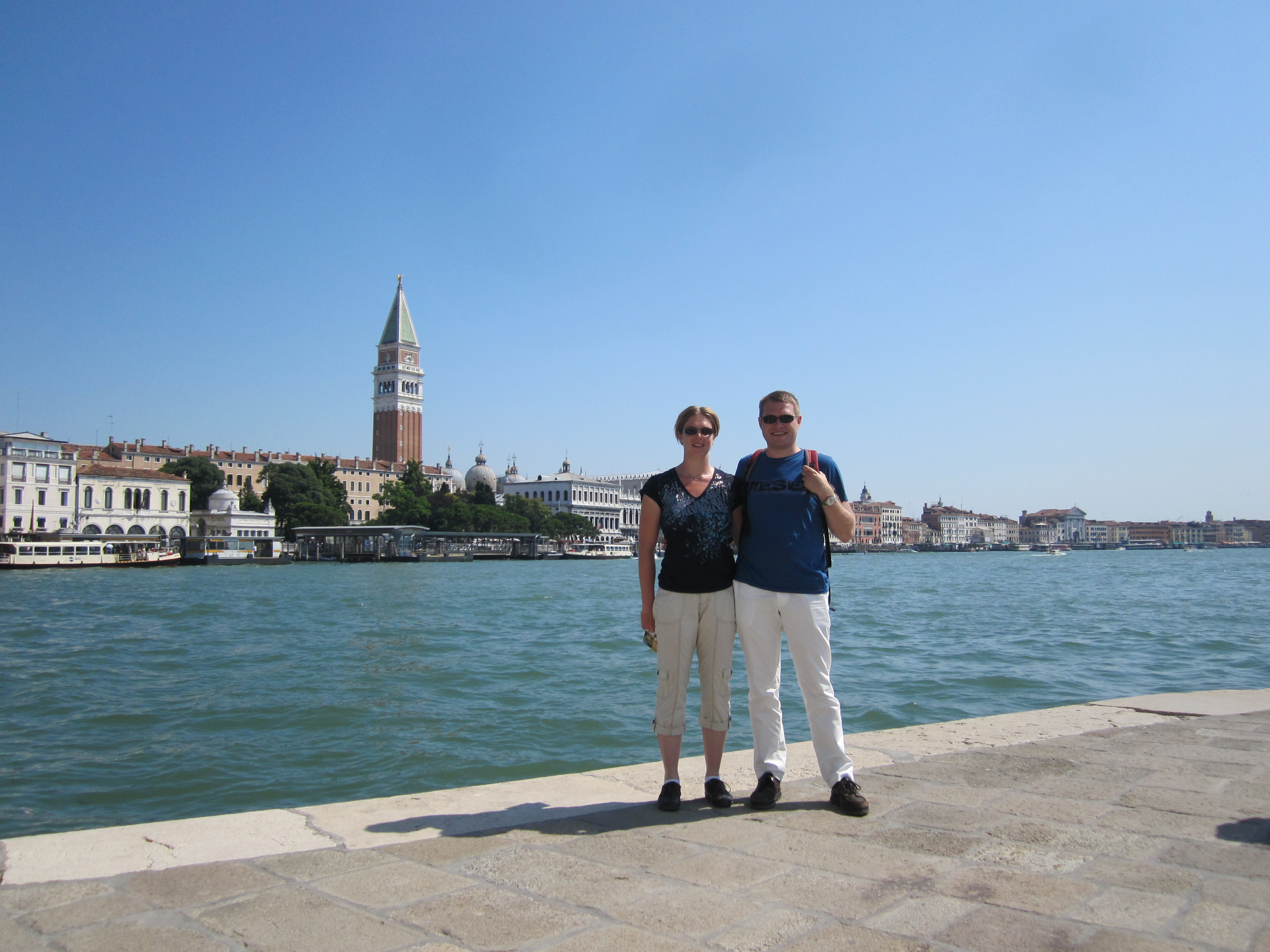 Vannochtend op tijd opgestaan voor het dagje Venetië. Na het ontbijt eerst met de auto naar Fusina. Gelukkig was de route goed aangegeven want deze ging over een industrieterrein met zware industrie. Je verwacht niet dat je bijna bij een camping bent (deze was bij het parkeerterrein voor Venetië-gangers) als je langs een alluminiumbedrijf komt. Vanaf Fusina met de watertaxi naar Venetië zelf. Onderweg hebben we ons alvast ingesmeerd, het was namelijk al erg warm en de zon brandde er flink op.