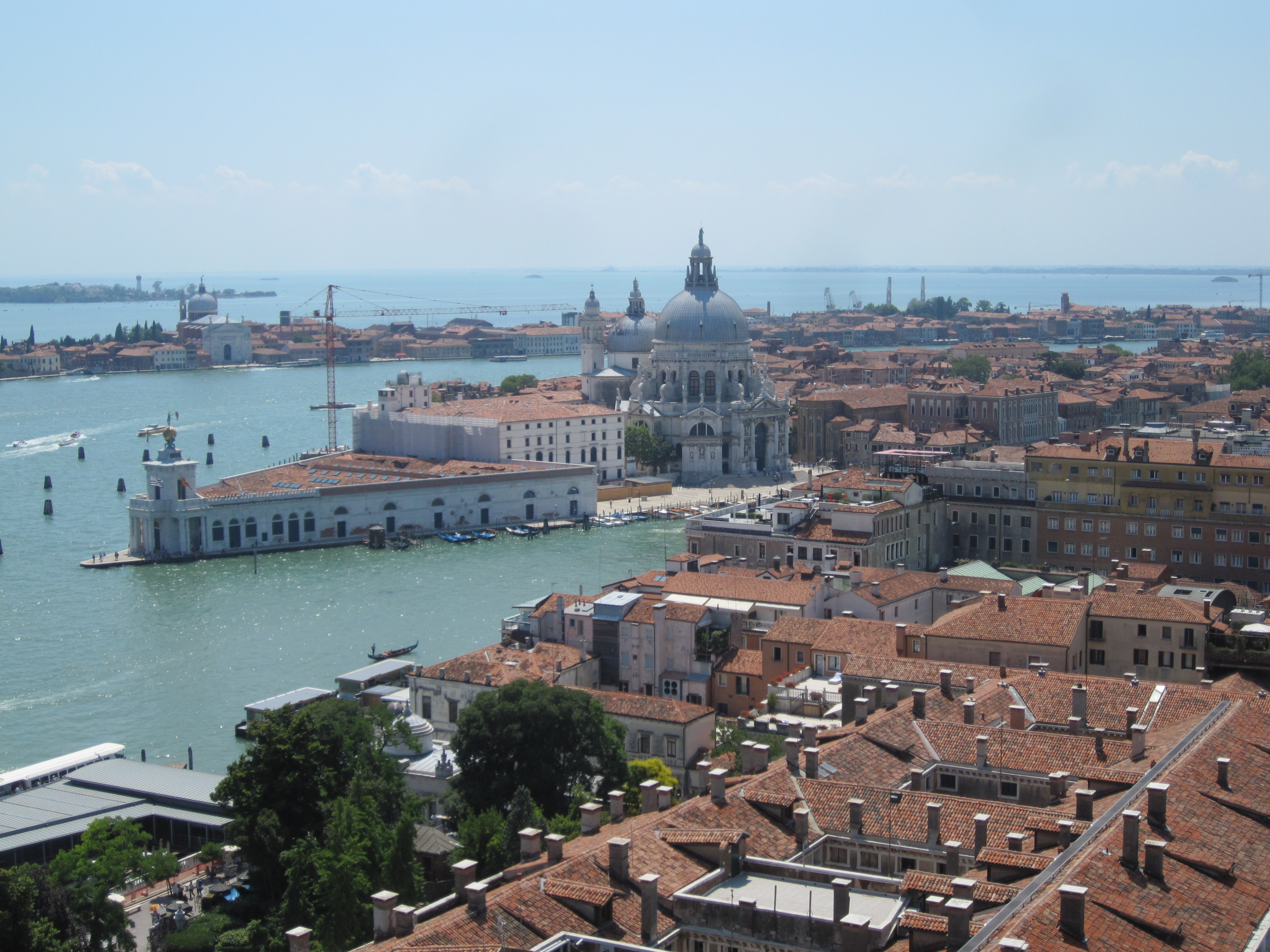Binnen mocht je geen foto’s maken (niet dat iedereen zich daar aan hield). Maar de met bladgoud belegde binnenkant van de koepels van de basiliek mochten wel eens gepoetst worden. Verder stond het aan de buitenkant trouwens deels in de stijgers net als elke grote kerk, cathedraal of basiliek die we deze vakantie gezien hebben. Nadat we beide een rondje in de basiliek gemaakt hadden zijn we in de rij van de Campanile (die grote toren op het San Marco plein) gaan staan Ook hier was het een stuk rustiger dan ‘s ochtends. Hier konden we bovenin komen wat een spectaculair uitzicht opleverde.