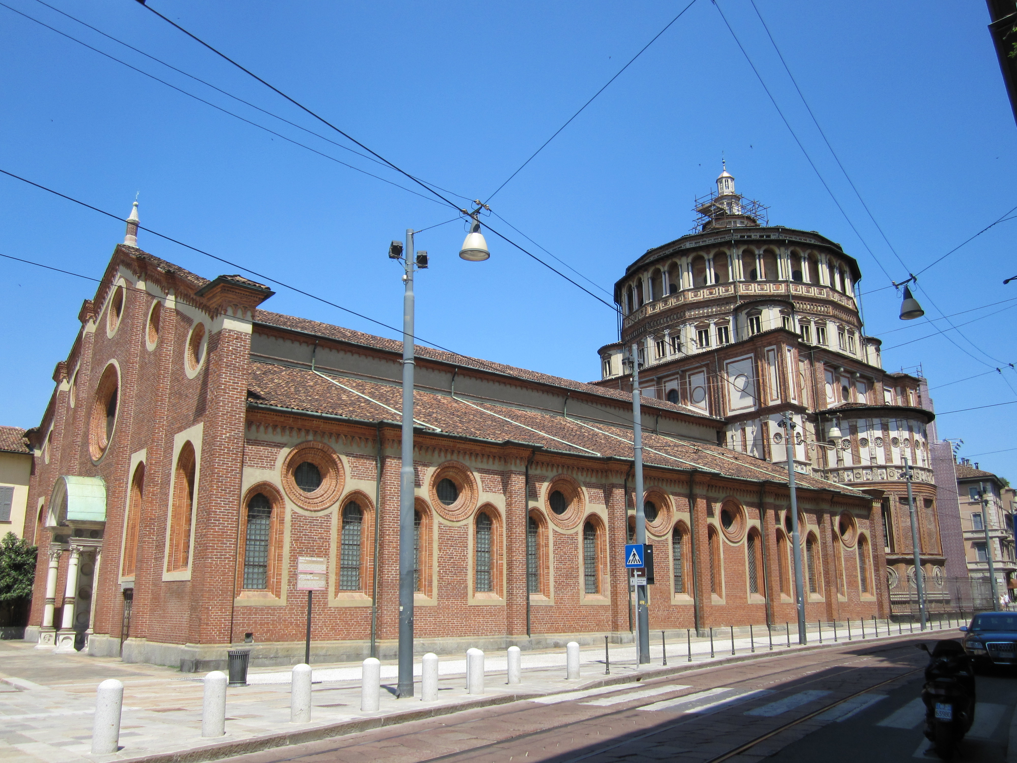 Toen we het eten op hadden kwamen we er ook achter dat Jeroen jarig is vandaag. Vanaf toen voelde hij zich opeens heel oud, en kon hij de lange wandeltocht door het park, via de “Vredesboog” naar de kerk  (zie foto) waar Davinci’s “Laatste avondmaal” hangt, nauwlijks volhouden. Daar aangekomen bleek ook nog eens dat je daar alleen in kon door van te voren te reserveren (wat we natuurlijk niet gedaan hadden). Onderweg hadden we nog wel een nieuwe bikini voor Saskia gevonden, dus er was toch nog wat goeds van de wandeltocht gekomen.