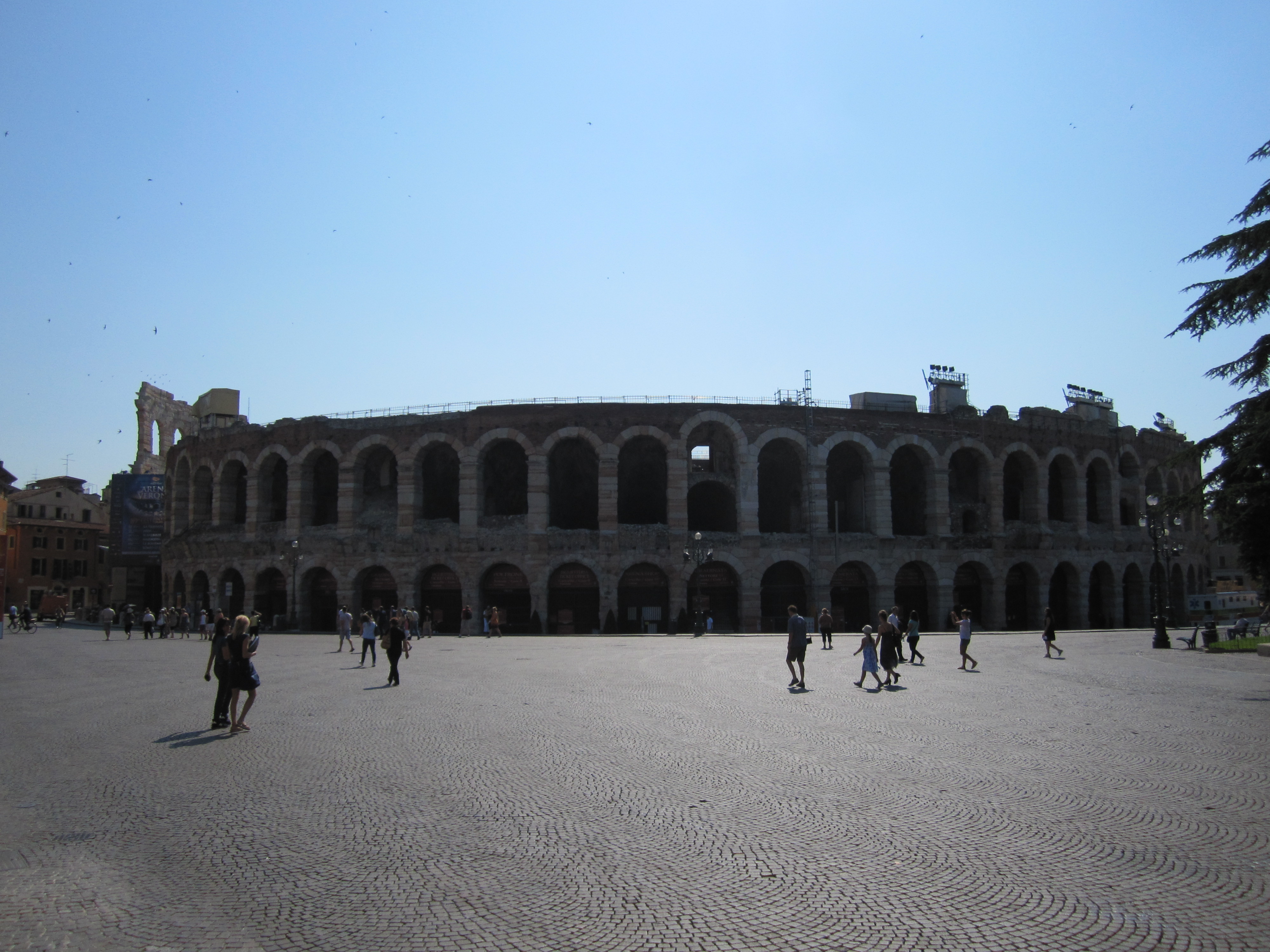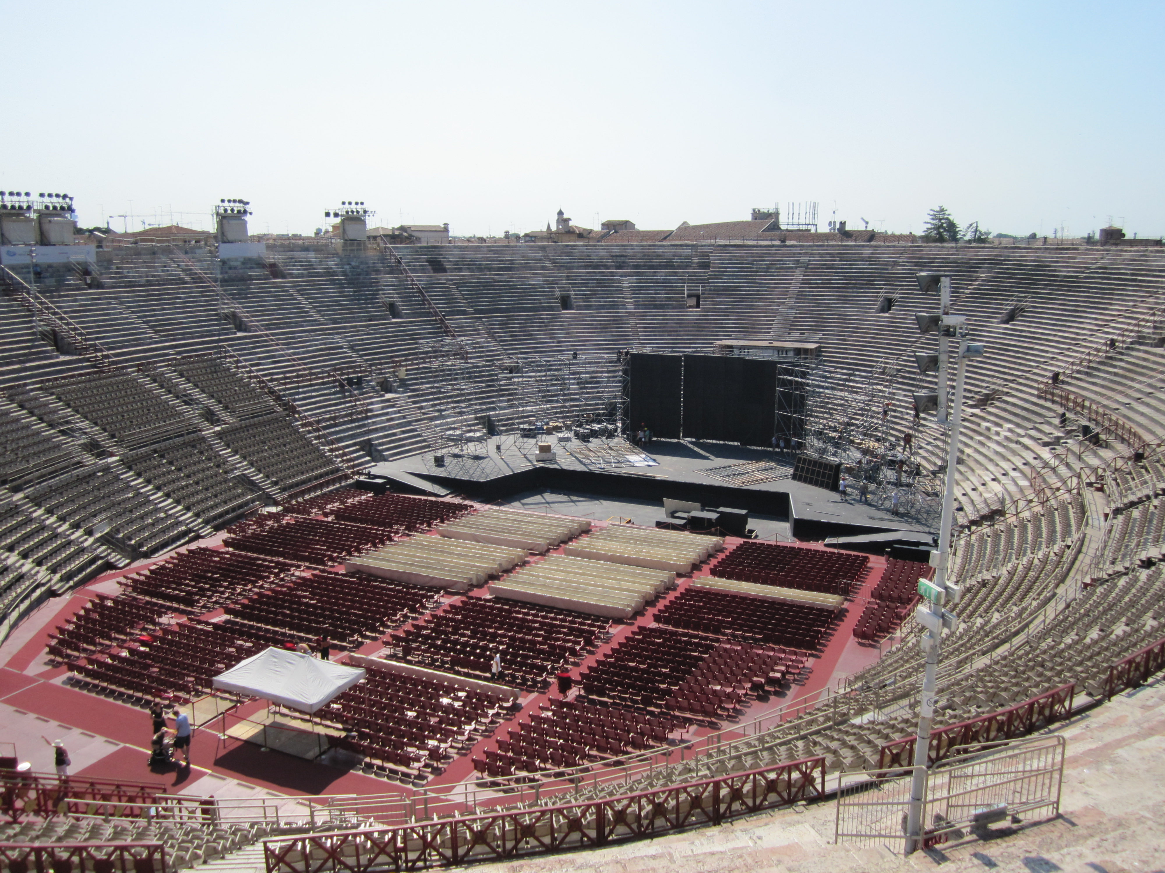 Bekendste bezienswaardigheid van de stad is een romeinse arena, 1 van de best bewaarde romeinse arena’s. Deze wordt nog elk jaar gebruikt voor een opera festival. Op de foto zijn ze alvast aan het opbouwen voor vanavond (Dante’s Divine Comedy wordt opgevoerd). Andere bezienswaardigheden zijn een aantal religieuze gebouwen (kerken dus), stadsmuren, vestingen uit de middeleeuwen en het huis van Julia (die van Romeo).