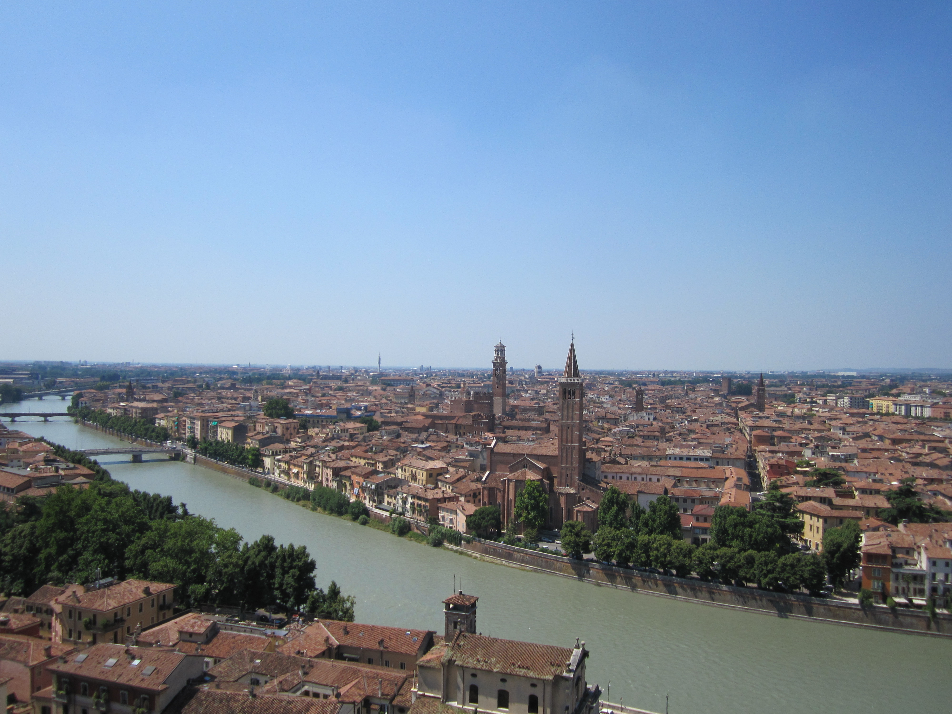 Omdat het weer 30+ graden zou worden overdag, hadden we bedacht het meeste loopwerk ’s ochtends te doen. Dit leek goed gelukt met een bezoek aan de arena, het huis van Julia, en een mooi uitzicht vanaf Castel San Pietro. Vanaf hier weer naar beneden gelopen richting het centrum voor een lunch ergens in een zijstraatje dit keer (dus niet de hoofdprijs zoals in Milaan). Het eten was gelijk een stuk beter en goedkoper.