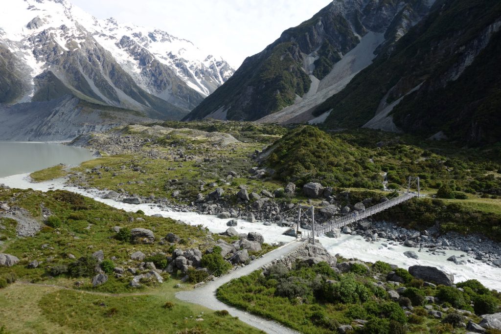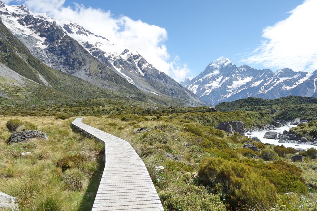 Vanochtend zijn we vanuit Twizel het Aoraki/Mount Cook Nationaal Park in gereden. De weg loopt langs het Pukakimeer, dat gevoed wordt door de gletsjers van de Zuidelijke Alpen. Hierdoor heeft het een haast onnatuurlijke blauwe kleur, veroorzaakt door zeer kleine rotsdeeltjes die door het gletsjerwater worden meegevoerd van de bergen. We komen uiteraard voor de hoogste berg van Nieuw Zeeland, Mount Cook met een hoogte van 3724 m. Dit is voor ons geen berg om te beklimmen, dat is voor doorgewinterde bergbeklimmers. Wij houden het bij een hike door de Hooker Vallei, die ons een prachtig uitzicht geeft op de berg. Niet onbelangrijk hierbij is het zonnige weer en het beperkte wolkendek. Er zijn dagen (ook in het voorjaar en de zomer) dat de berg volledig verdwijnt in wolken en nevel.