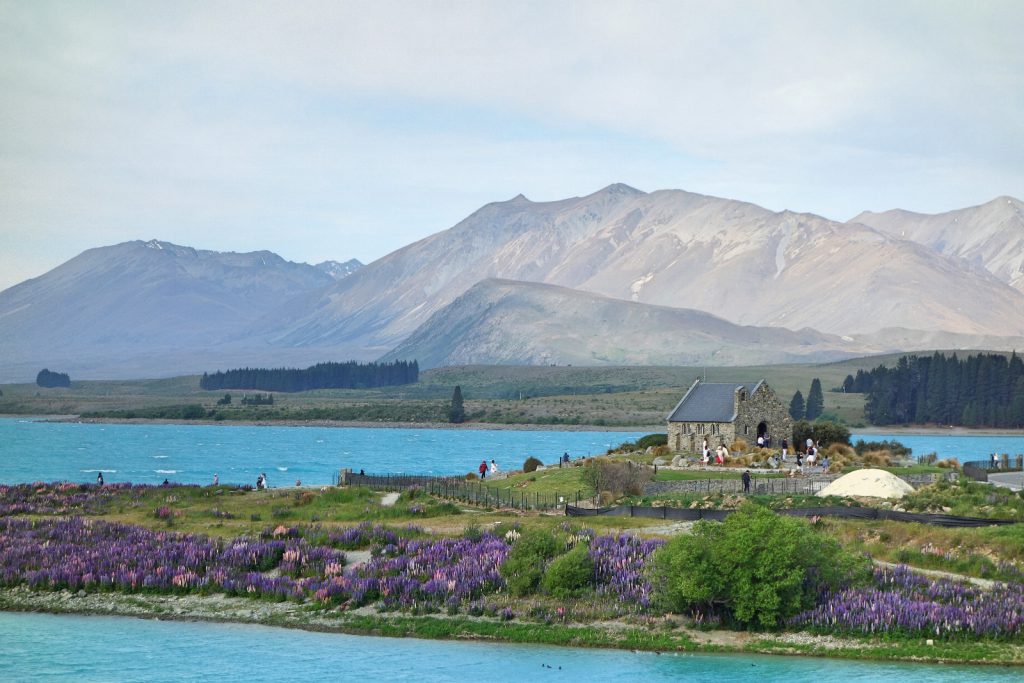 Voor de rit naar onze slaapplaats van vanavond, in de plaats Lake Tekapo, moesten we eerst weer het park uit via dezelfde weg. In de zijspiegels zie we Mount Cook langzaam uit beeld verdwijnen, maar later op onze route hebben we nog een paar keer uitzicht op de andere kant van de berg.