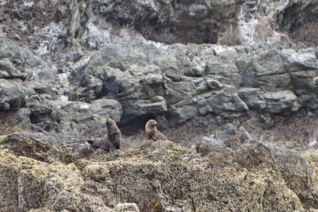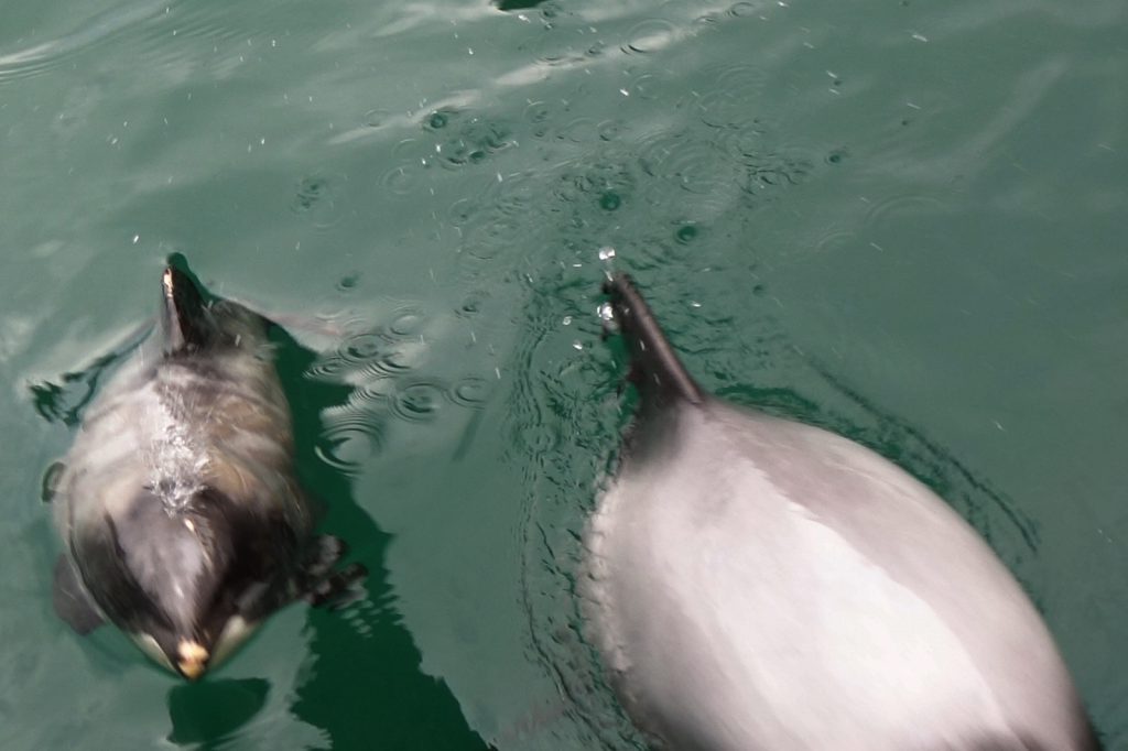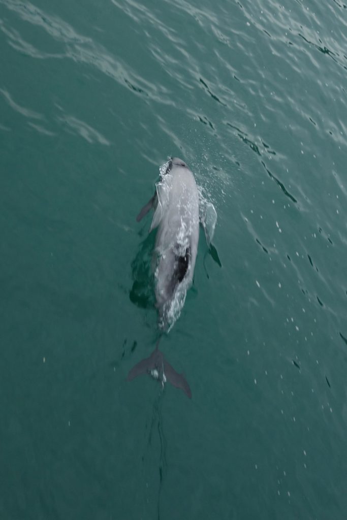 Nadat we gedoucht hebben gaan we ‘s middags mee op een boot om dolfijnen te spotten en dat is gelukt! Kleine groepjes Hector’s dolfijnen kwamen vlak bij de boot en bleven ook een beetje rondhangen omdat ze graag ‘meerijden’ op de boeggolf. Wel lastig om ze op de foto te krijgen. Jeroen’s heeft zijn best gedaan (klik, klik, klik) maar we hebben vooral gekeken zonder camera hoe ze door het water schieten en boven komen om adem te halen. We hebben zelfs een moeder met een kleintje gezien. We gingen ook een klein stukje de baai uit, waar we op de rotsen nog wat pelsrobben hebben zien zonnebaden en daarnaast veel aalscholvers. Deze nestelen hoger op de rotsen. Zelfs op de weg terug naar de haven kwamen er opnieuw dolfijnen om de boot zwemmen.
