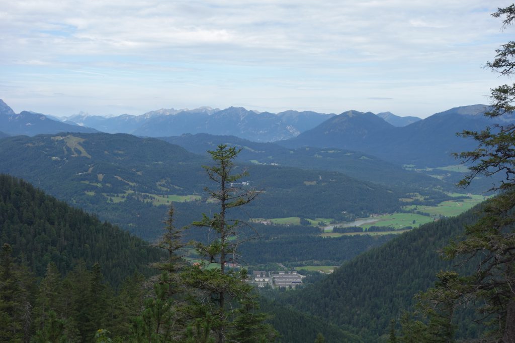 We kunnen onze auto in Mittenwald kwijt bij een laadpaal. Dat komt mooi uit, kan deze even bijtanken terwijl we aan het wandelen zijn. We starten rond 10 uur en moeten eerst een klein stukje door het dorp, waar het gezellig druk is. Daarna gaan we het bos in en gaan we ook snel omhoog. Het grootste gedeelte van de route omhoog is een smal paadje waarbij we achter elkaar moeten lopen. De ondergrond is afwisselend zachte bosgrond, grove stenen en soms wat rotsachtig. Richting het hoogste punt is er wat meer gras. We waren net iets voor de middag op dat hoogste punt. Een mooi moment om even bij te komen op een bankje en ons broodje met de thee soldaat te maken.