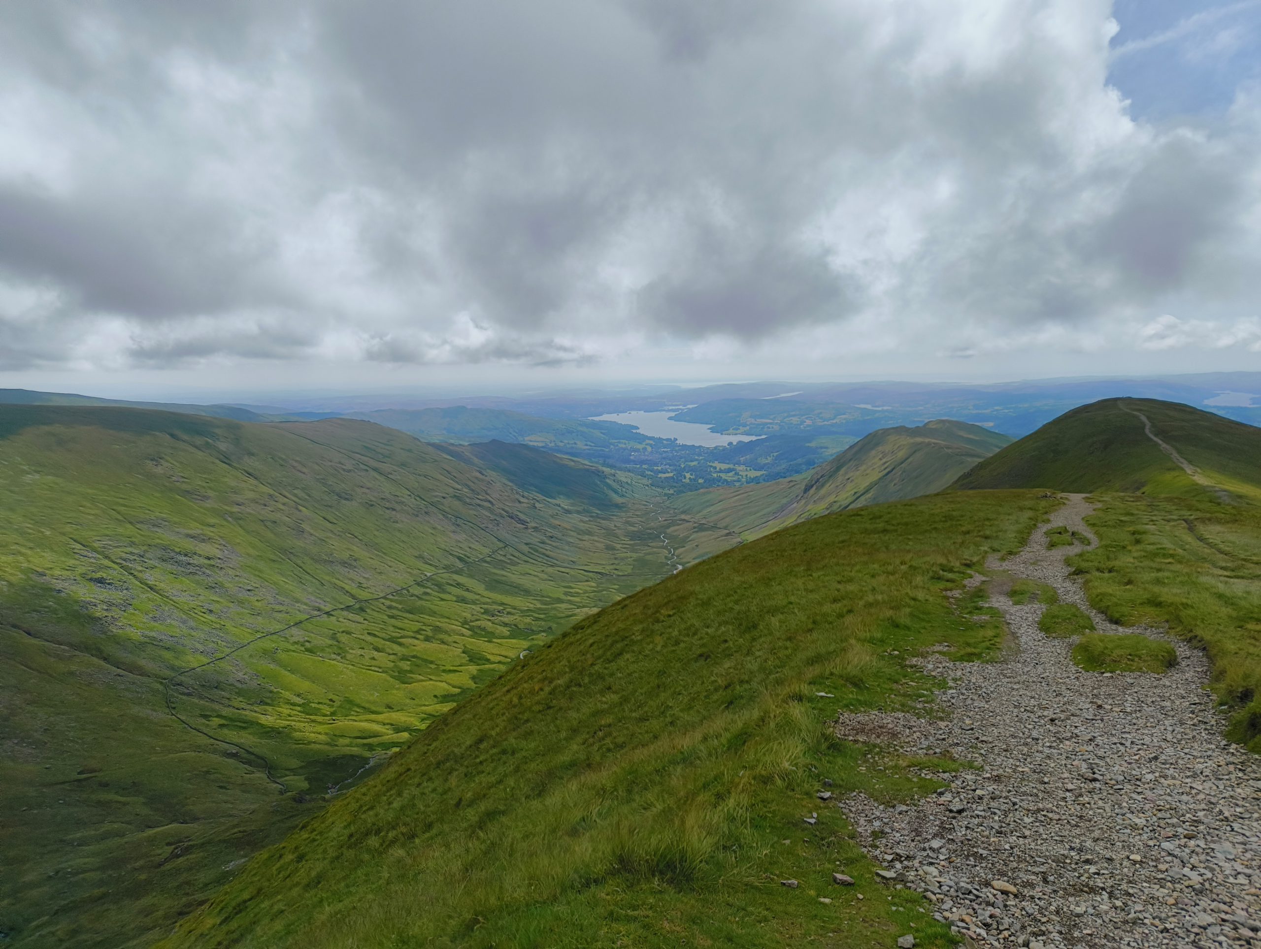 Vandaag wederom een mooie dag om te wandelen. Na het ontbijt stappen we in de auto voor het korte ritje naar het startpunt in het naastgelegen dorp Rydal. De route van vandaag is ongeveer in de vorm van een hoefijzer, waarbij we over verschillende piekjes gaan. Het eerste deel van de route stijgen we het snelst. Daarna vlakt het iets af en komen we over vier pieken: Low Pike, High Pike, Dove Crag en Hart Crag waarbij we elke keer iets hoger uitkomen. Regelmatig maken we korte stop om ons heen te kijken. Het hoogste punt van vandaag is Fairfield, wat een wat groter vlak gedeelte is. Jammer genoeg zitten we net op dat moment midden in de laag hangende wolken waardoor we op dit punt geen uitzicht hebben. Daarnaast waait er ook een stevige wind. Als we iets verder lopen en een beetje dalen is de wind wat minder en zitten we net onder de wolken waardoor het uitzicht een stuk beter is. Aan verschillende kanten kunnen we wegkijken het dal in. Ook in de tweede helft hebben we nog een aantal, nu steeds lager wordende, pieken: Great Rigg, Heron Pike en Nab Scar. Uiteraard komen we ook nu weer hier en daar een paar schapen tegen. Je ziet hier niet veel helemaal witte schapen. Wat meer voorkomt is wit met een zwarte kop (met hoorns) en zwarte poten of juist andersom: zwart (meer grijs eigenlijk) met een witte kop en witte poten. Na Nab Scar dalen we snel en dat beginnen we na 1000 hoogtemeters en ca 14 km in de benen toch wel een beetje te voelen, gelukkig dan nog maar 2 km te gaan. We waren rond twee uur weer terug bij de auto. De route was op de heen- en de terugweg op de meeste plekken wel duidelijk te volgen. Soms een grindachtig pad en hier en daar door het gras, maar vooral ook veel grotere stenen (soms een beetje aangelegd als een soort trap) en rotsen.