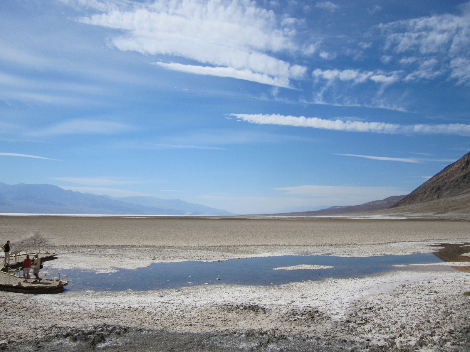 Vandaag na het ontbijt op weg naar de warmste plek van onze vakantie, Death Valley. Inderdaad nog net iets warmer dan Las Vegas. Overdag was er gelukkig nauwelijks wind, waardoor het beter vol te houden was. We waren rond 1 uur bij ons hotel, waar we eerst geluncht hebben. Vervolgens zijn we het park in gegaan, uiteraard met een ruime hoeveelheid water in de kofferbak. Eerst zijn we naar Badwater gereden het laagst gelegen punt op het westelijk halfrond (86 meter onder zeeniveau), hier konden we ook direct de zoutvlakte van dichtbij bewonderen.