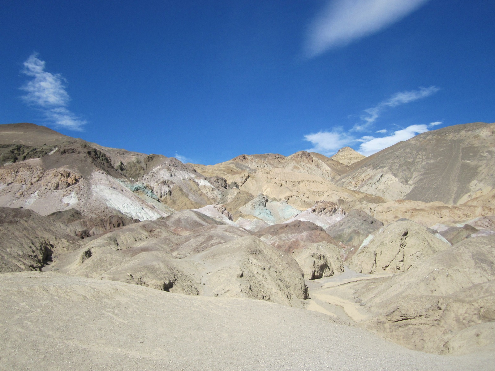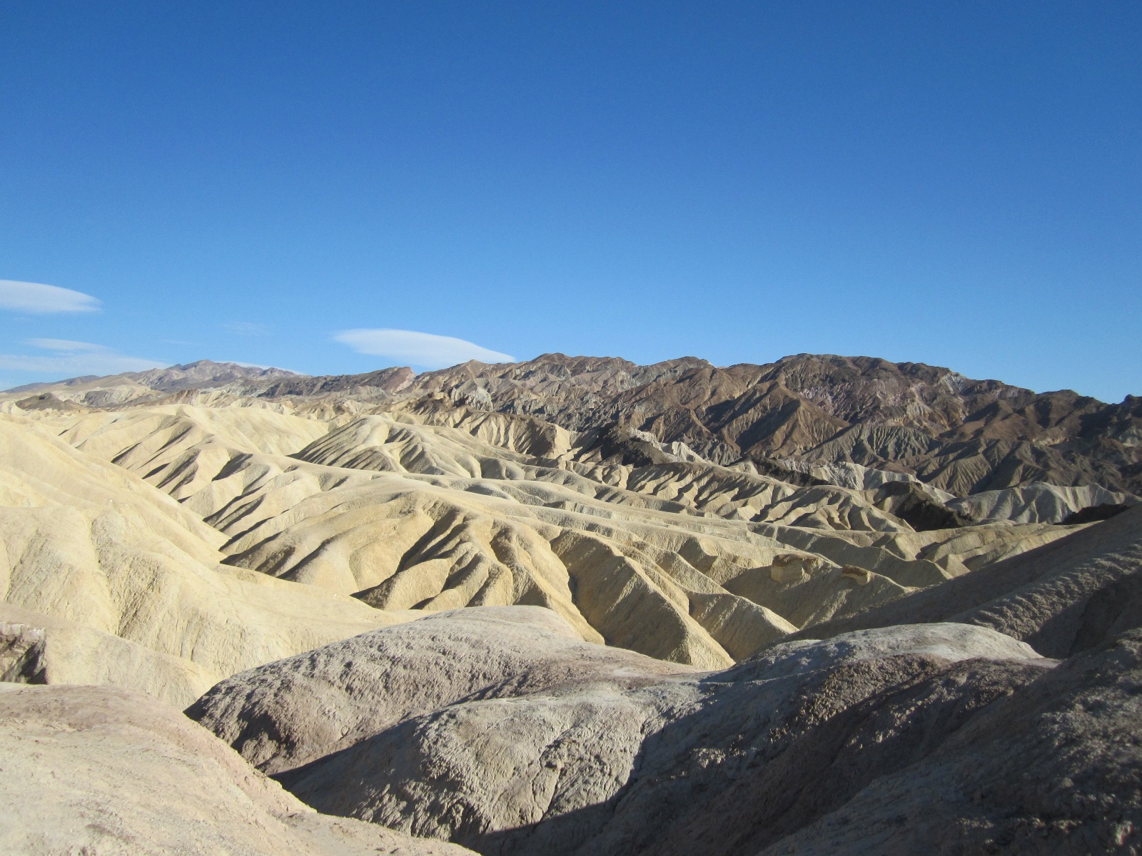 Vervolgens via het kronkelende Artists Drive terug en naar Dante’s View. Vanaf hier kun je zowel het laagste als het hoogste punt van Death Valley zien. Vooral de weg er naar toe was leuk om te rijden; krokkelend en steil (laatste paar honderd meter 15 % stijging). Op de terugweg naar het hotel ook nog bij Zabriskie Point gestopt. Na het eten zijn we nog even wezen zwemmen (onverwarmd, watertemperatuur ca 30 graden).