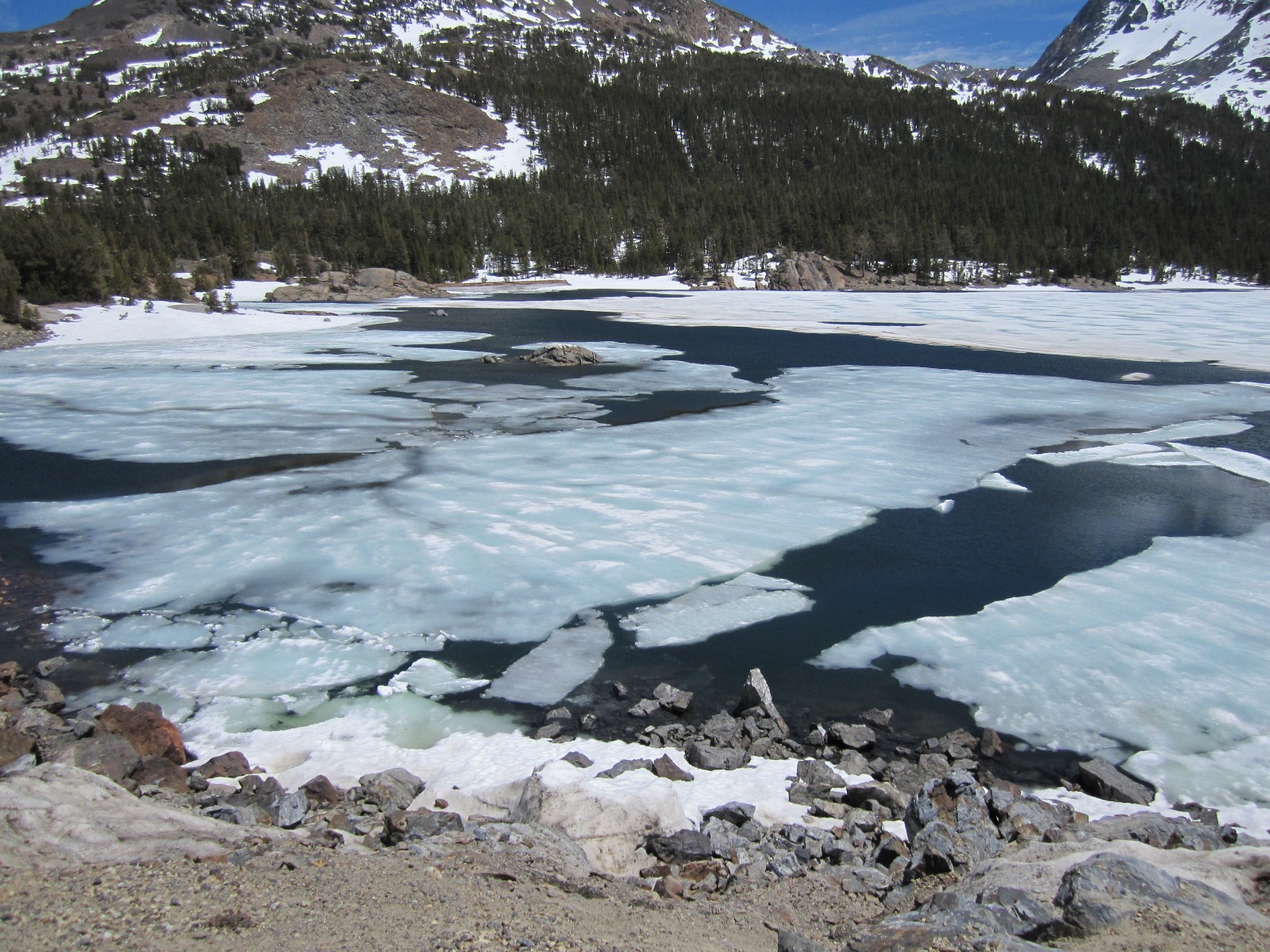 Het was goed aan het smelten maar op veel plaatsen lag toch nog wel een halve meter tot een meter sneeuw. Ook meren waar de ijsschotsen nog op dreven reden we regelmatig voorbij. Al het smeltwater zorgde natuurlijk voor de nodige snelstromende riviertjes en watervallen van de rotsen.