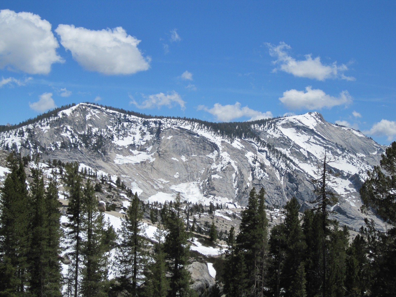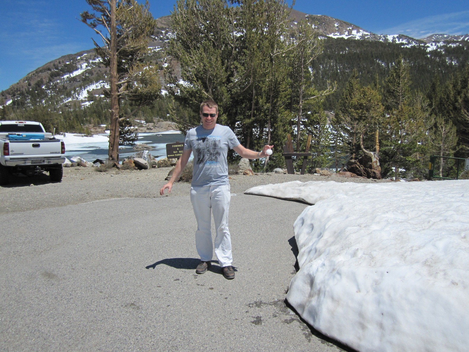 Het verschil met gisteren kon niet groter. ‘s Ochtends was het in Death Valley natuurlijk nog erg warm (boven de 35 graden om 8 uur), maar zodra we via de bochtige bergweggetjes de vallei uit waren gereden doemden de besneeuwde toppen van de Sierra Nevada al voor ons op. Saskia was er nog niet helemaal van overtuigd dat we binnen handbereik van echte sneeuw zouden komen, maar toen we eenmaal de klim van de Tioga Pass waren begonnen was al snel duidelijk dat dit wel het geval zou zijn.